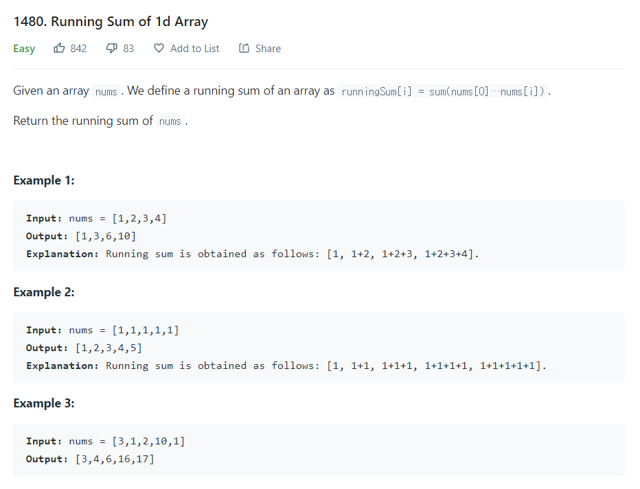 - 배열 첫번째 인덱스 부터 각각의 인덱스까지의 누적 합계를 구하는 문제이다.