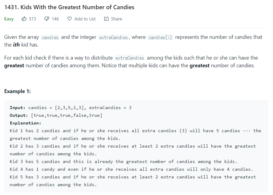 - 각 아이들(candies[index])에게 일정량의 캔디(extraCandies)를 주었을 때 전체 아이들중에서 가장 많은 캔디를 가지고 있는가?