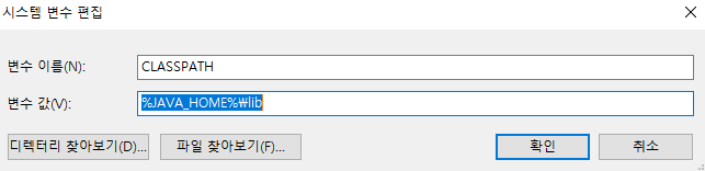 - Window 기준으로 시스템 환경 변수 설정 시 JAVA_HOME(Java가 설치된 경로) 아래 lib을 CLASSPATH로 지정하였다.