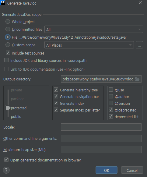 - JavaDoc scope로 현재 파일 지정(File)