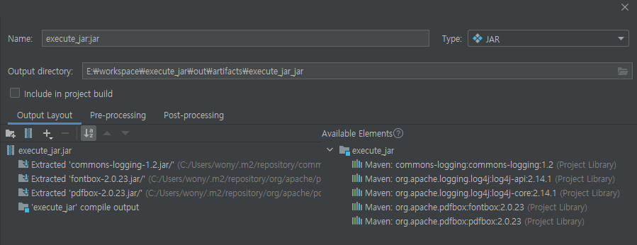 - 우측 Available Elments에는 Library가 잡히지만 실제 생성될 execute.jar에는 포함되지 않고 있다.