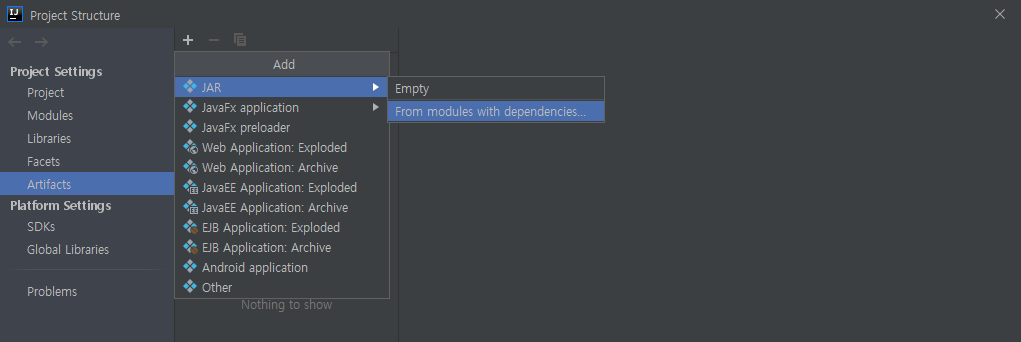 2.1. Project Structure - Artifacts - Add(+ 버튼) - From modules with dependencies